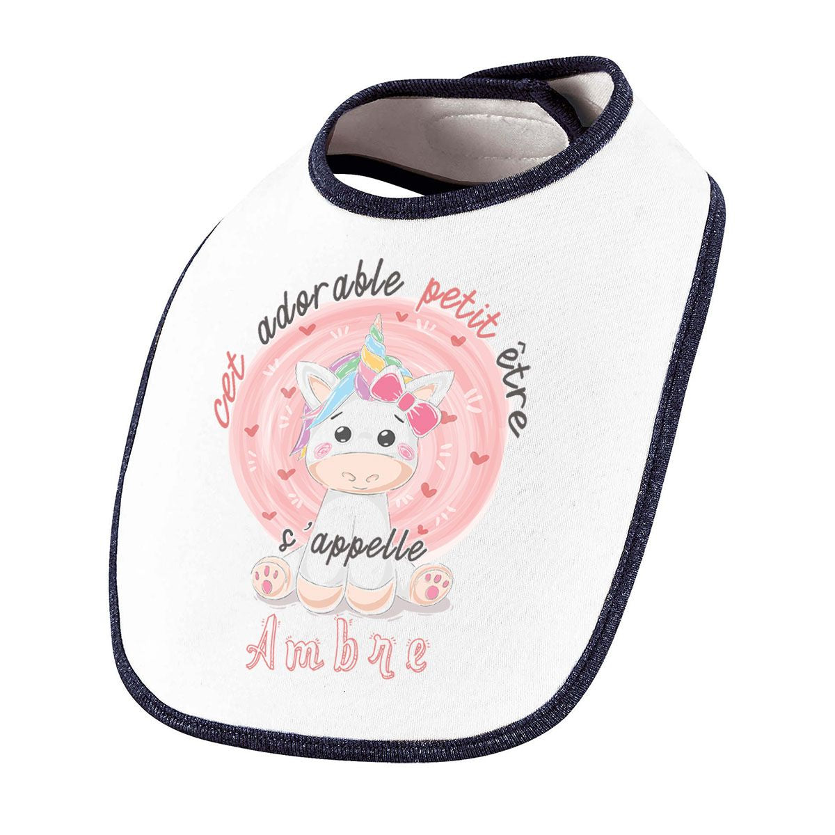 Ce bavoir personnalisé est un cadeau adorable pour le futur bébé prénommé Ambre et la possibilité de le remplacer par n’importe quel prénom. Avec une illustration de licorne, ce bavoir apportera une touche magique et mignonne à chaque repas de bébé. En ajoutant son prénom, vous créez un cadeau unique qui lui rappellera votre affection dès les premiers instants de sa vie.