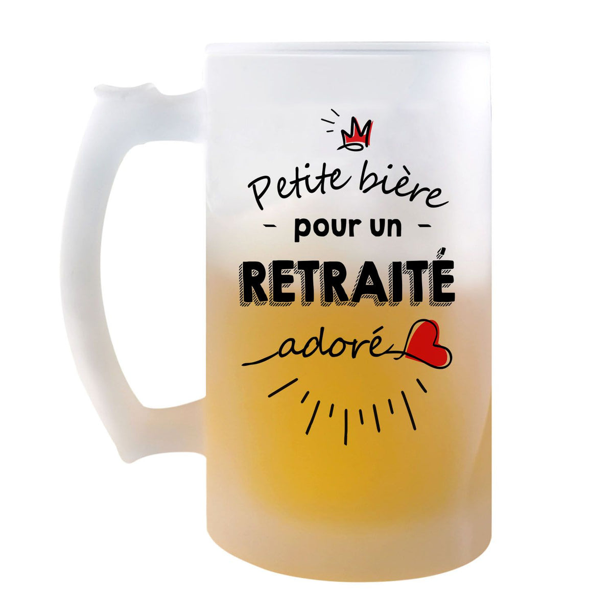 Cette chope de bière est un excellent cadeau pour un collègue amateur de bière. Avec l'inscription "Petite pinte d'un retraité adoré", il pourra savourer sa boisson préférée et se remémorer les bons moments passés avec ses collègues.